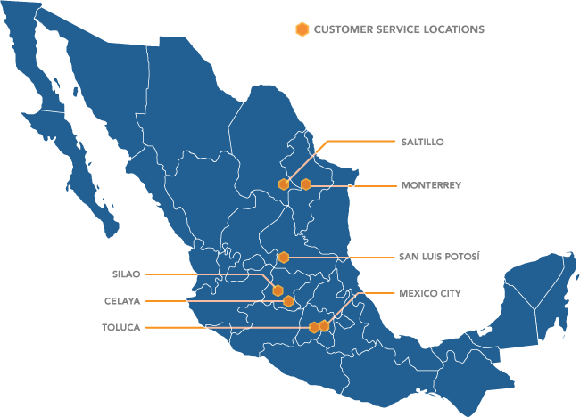 Customer Service Locations: Monterrey, Saltillo, DF, Toluca, Silao, Celaya, San Luis Potosí.