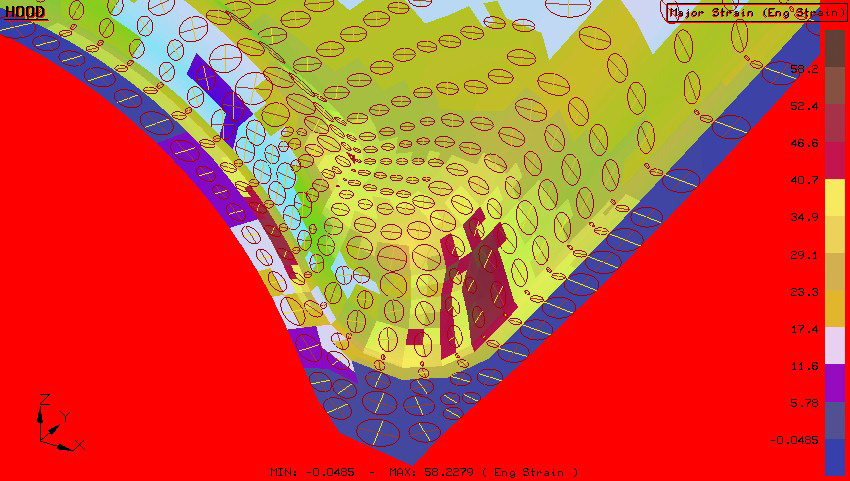 Análisis de Formabilidad: análisis de alta calidad de esfuerzo y del panel para determinar la estabilidad, robustez y oportunidades de mejora del dado. Lleva a la mejor planeación de los dados con el personal del departamento de dados, y crea paneles de referencia para utilización en piso.